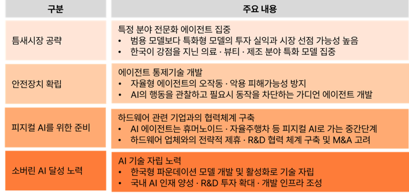 마지막으로 보고서는 “해외 AI 파운데이션 모델에 과도하게 의존해 기술 자립에 손 놓아서는 안 된다”고 지적하며 ‘소버린(Sovereign∙주권) AI’ 달성을 위한 자체 AI 기저 기술 개발도 병행해야 한다고 조언했다.