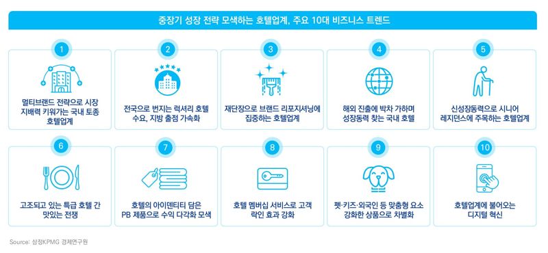 보고서는 이러한 흐름을 반영한 '국내 호텔 시장의 주요 10대 트렌드'로 △멀티브랜드 전략 △지방 출점 확대 △브랜드 리포지셔닝 △해외 진출 가속화 △시니어 레지던스 진출 △호텔 레스토랑 경쟁 심화 △PB(자체 브랜드) 사업 확대 △호텔 멤버십 서비스 강화 △객실 상품 차별화 △디지털 혁신 등을 제시했다.