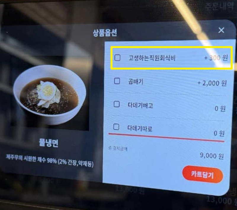 작성자 A씨는 식당 키오스크 주문 화면 사진을 공개했다. 해당 사진에는 '고생하는 직원 회식비'라는 이름으로 300원을 추가로 선택할 수 있는 유료 옵션이 표시돼 있다.