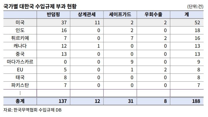 보고서에 따르면 미국은 지난달 기준 한국에 대해 반덤핑 37건, 상계관세 11건, 세이프가드 2건, 우회 수출 2건 등 총 52건의 수입 규제 조처를 했다. 이는 2위인 인도(18건), 3위 튀르키예(16건)보다 높다. 같은 기간 중국은 반덤핑 규제만 13건 받는 데 그쳤다.