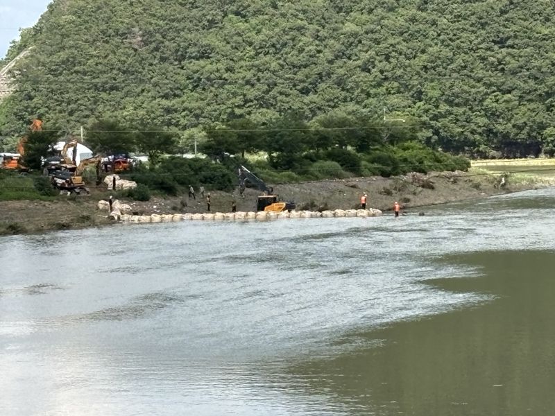 이는 맨처음 누수 지점으로 알려진 사연교 아래에서 상류 쪽으로 1km 떨어진 곳이다. 위쪽에 위치한 무동교를 통해 복구장비들이 투입되고 있다.