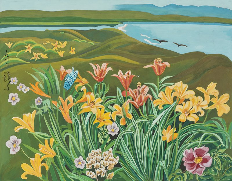 봄부터 가을에 걸쳐 다양한 꽃들이 계속 피어나는 북해도는 천경자에게 생경한 풍경이었다. 시야 가득 펼쳐지는 거대한 풍경을 표현하기 위해 작가는 주황색의 애호박나리와 노란색의 애기붓꽃을 풍성하게 배치하고 푸른색의 층층이부채꽃과 자주색의 해당화 등으로 색감을 더했다. 뒤편 경관에는 좌우로 원추리꽃과 한 쌍의 새를 묘사해 마치 초여름 아침의 화원을 산책하는 느낌을 갖게 한다.
