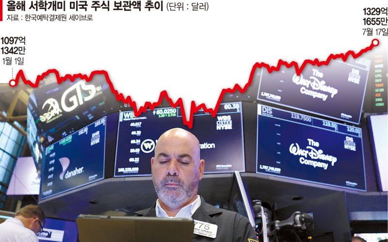 서학개미의 순매수세에 미국 주식 보관액도 사상 최고치를 새로 썼다. 지난 16일 1317억달러로 1300억달러를 처음으로 돌파한 후 17일에는 1329억원까지 늘어났다.