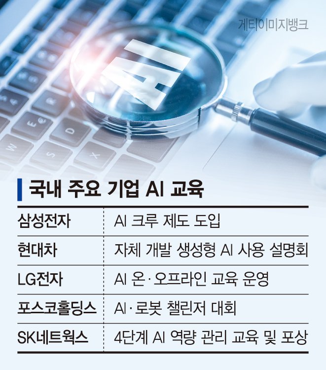 LG 및 SK 계열사 등은 사내 AI 교육에 집중하고 있다. LG전자는 생성형 AI 입문과정부터 LG AI연구원이 개발한 챗 엑사원(EXAONE) 등을 실제 업무에서 적용하는 방법을 알려주는 온·오프라인 교육을 하고 있다.