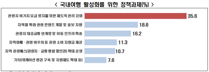 국내여행 활성화를 위해 필요한 정책으로는 관광지 바가지 요금 방지를 위한 제도적 관리 강화가 35.6%로 가장 많은 응답을 차지했다. 이어 지역별 특화 관광 콘텐츠 개발 및 홍보 지원 18.6%, 관광지 대중교통 연계망 및 이동 인프라 확충 16.2%, 지역화폐·관광 바우처 등 관광 소비 지원금 제공 11.3% 등의 순이었다.