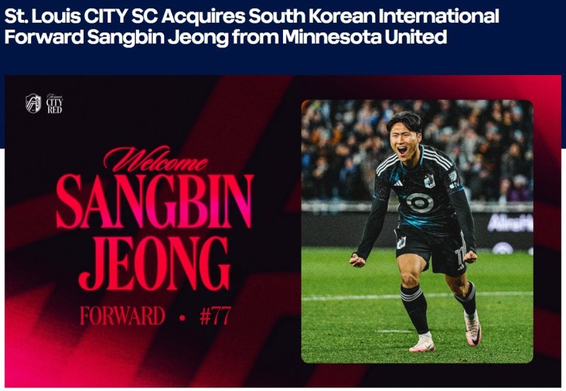 MLS에서 뛰는 정상빈, 미네소타에서 세인트루이스로 이적이적료 160만달러…성적에 따른 인센티브 40만달러