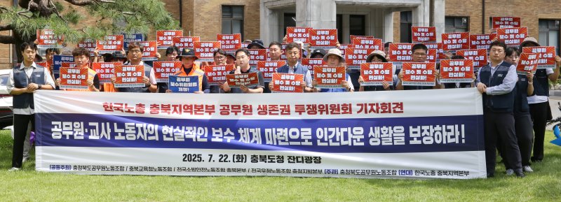 한국노동조합총연맹(한국노총) 충북지역본부와 충북 도청·교육청·소방·우정 4개 직역의 공무원·교사 노조는 이날 오전 도청 잔디광장에서 기자회견을 열고 "공무원보수위원회(공보위)는 2026년도 공무원 임금 인상률을 2.7~2.9%로 결정했다"며 "공무원 보수는 수년간 물가 상승률에 미치지 못한 채 제자리걸음하고 있다"고 지적했다.