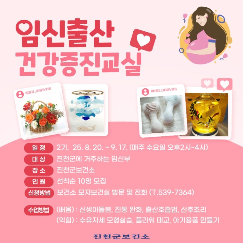 이번 교육은 군 보건소에서 다음 달 20일부터 9월17일까지 매주 수요일 오후 2~4시 진행된다. 교육 내용은 ▲산전 관리 신체활동 및 출산 호흡법 ▲효과적인 모유 수유 방법 ▲아기용품 및 태교 공예 만들기 등이다.