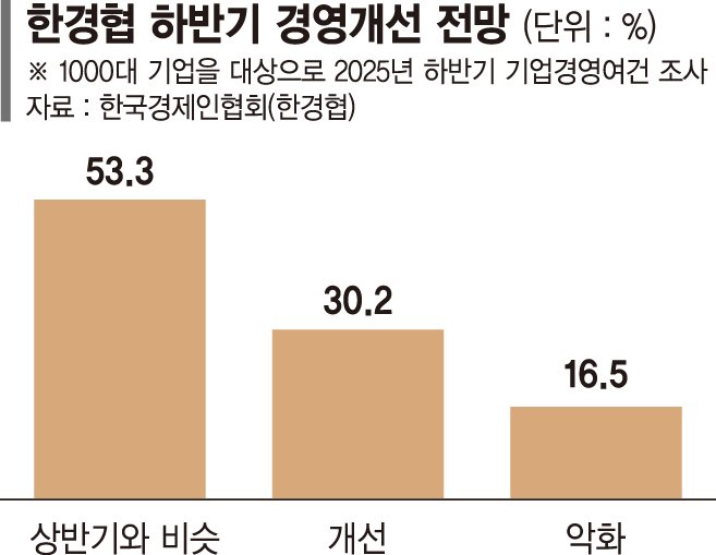 이상호 한경협 경제산업본부장은 "하반기 경기전망이 다소 낙관적으로 나온 것은 상반기 경기침체의 강도가 워낙 깊었던 데 따른 기저효과의 측면이 크다"면서 "새 정부의 경제활성화 정책이 추진될 것이라는 기대감과 함께 글로벌 인공지능(AI) 투자수요 확대에 따른 관련 업종 호조 전망 등도 반영된 것"이라고 설명했다. 이 본부장은 "다만 한국 경제의 중요한 축인 수출에 영향을 미치는 통상 불확실성이 커지는 것은 변수"라며 "통상환경 대응과 함께 규제개선 등 경영환경 개선을 위한 정부의 노력이 필요하다"고 덧붙였다.