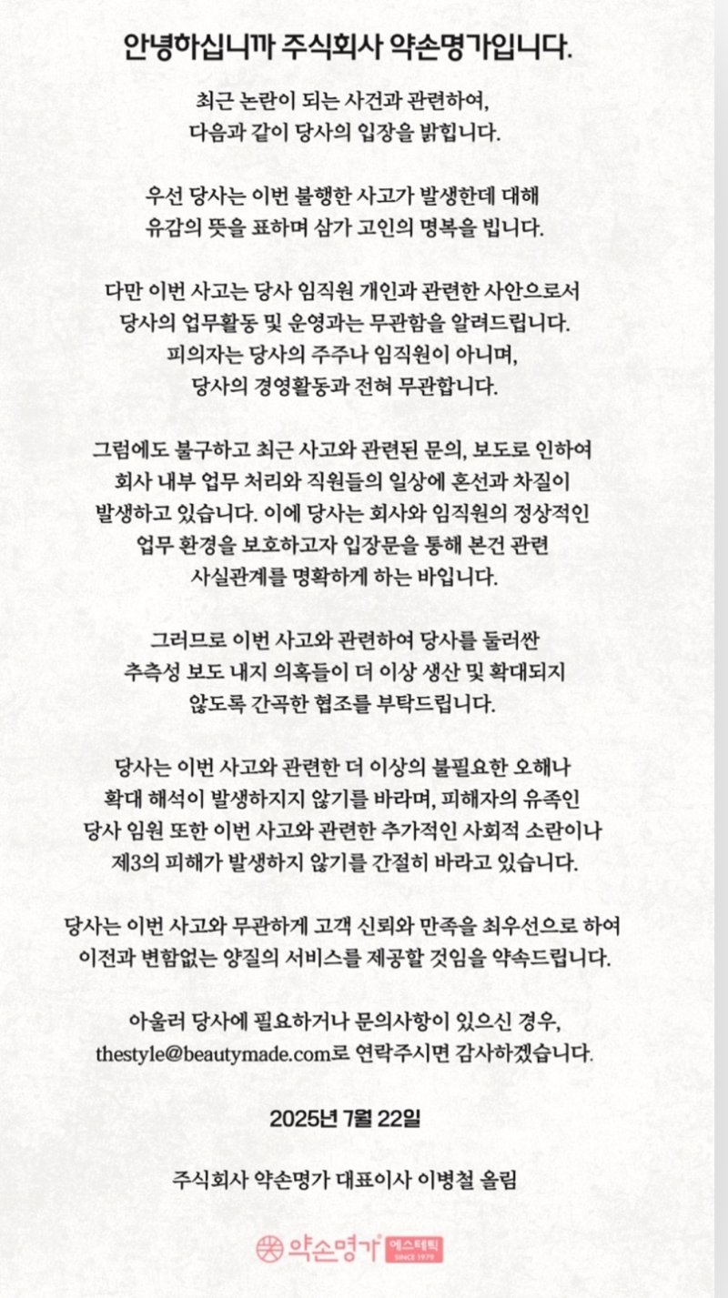 피부관리 업체 '약손명가'는 22일 홈페이지에 입장문을 통해 "이번 사고는 당사 임직원 개인과 관련한 사안으로서 당사의 업무활동 및 운영과는 무관하다"라며 "피의자는 당사의 주주나 임직원이 아니며 당사의 경영활동과 전혀 무관하다"고 밝혔다.