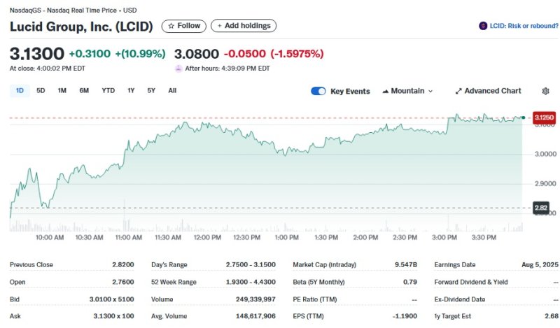 22일(현지 시간) 뉴욕증시에서 루시드는 10.99% 폭등한 3.13달러를 기록했다. 루시드의 주가가 3달러를 넘어선 것은 지난 2월 21일 이후 처음이다.