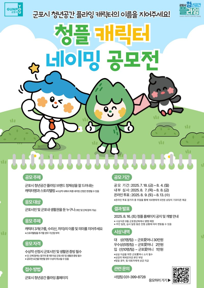 경기 군포시는 관내 청년공간 플라잉(청플)이 '청플 캐릭터 이름짓기 공모전'을 연다고 28일 밝혔다. 이번 공모는 센터 브랜드 정체성을 강화하고 시민과의 소통을 확대하기 위해 기획했다.