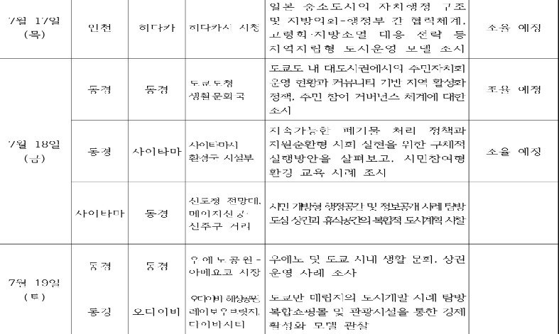의장들은 첫날과 둘째 날 히다카시와 도교도청, 사이타마 등 3개 지자체를 방문한 뒤 신도청 전망대와 메이지 신궁, 신주쿠 거리 등 관광명소를 둘러봤다.