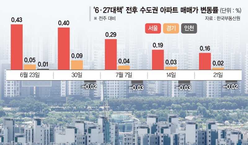 한편 한국부동산원이 이날 발표한 '주간 아파트값 동향'을 보면 서울 아파트 매매가격은 0.16% 올라 전주(0.19%) 대비 상승폭이 0.03%p 축소됐다. 6·27 부동산 대책 영향이 이어지면서 서울 아파트 매매가격 상승세가 4주째 둔화 흐름을 보이고 있다.