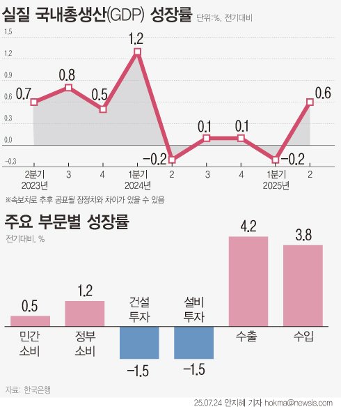 [서울=뉴시스]남주현 기자 = 올해 2분기(4~6월) 우리나라 경제가 전기 대비 0.6% 성장하며 15개월 만에 저성장의 늪에서 벗어났다. 반도체 수출 회복과 민간소비 반등이 성장을 견인한 가운데, 연간 1%대 성장률 달성에 대한 기대감도 커지고 있다. 다만, 트럼프 관세 정책 등 대외 불확실성이 변수다.