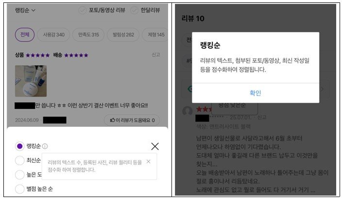 자체 알고리즘 정렬 방식은 리뷰 글자 수, 작성일, 평점, 사진 포함 여부 등 각각 기준이 달랐다. 다만 대부분 평점이 높거나 장점 위주로 묘사된 리뷰를 먼저 표시했다.