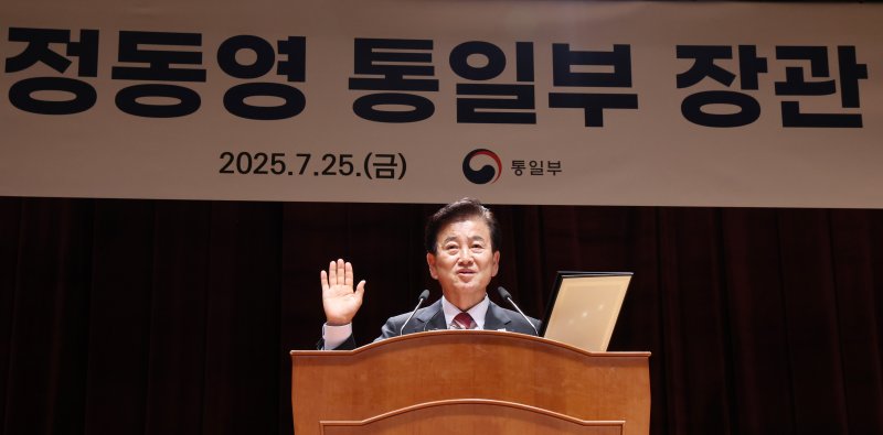정 장관은 25일 오후 서울 정부서울청사 별관에서 열린 제44대 통일부 장관 취임식에서 "잘 아시다시피 저는 전주가 지역구인 국회의원이지만, 통일부는 제 신념의 지역구"라며 "이재명 대통령이 저를 다시 통일부 장관으로 보낸 것은 무너진 한반도 평화를 복원하고, 남북관계를 개선하라는 특명이라고 생각한다"라고 서두를 뗐다.
