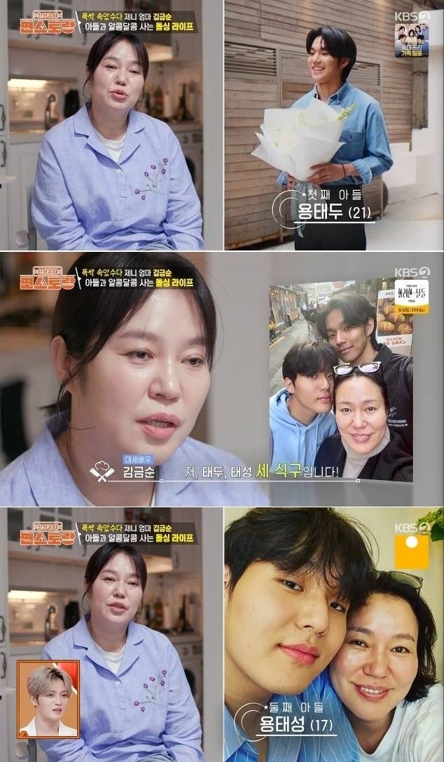 김금순은 25일 방송한 KBS 2TV '신상출시 편스토랑'에서 "('폭싹 속았수다'에서) '제니'(김수안) 엄마로 많은 사랑을 받은 김금순"이라며 "나, 첫째 아들 태두, 둘째 아들 태성 세 식구다. 화려한 돌싱이다. 태성인 미국에서 고등학교 다니고, 나와 태두는 같이 살고 있다"고 밝혔다.