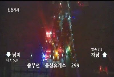 (음성=연합뉴스) 김형우 기자 = 26일 오전 0시 29분께 충북 음성군 삼성면 양덕리 중부고속도로 대전방향 삼성(하이패스)IC 인근에서 화물차와 승용차 등 4대가 연쇄 추돌하는 사고가 났다.