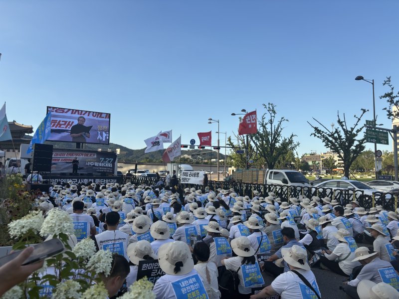 이날 서울 낮 최고기온이 38도에 육박하는 등 무더위 속에서 참가자들은 흰색 반팔 티셔츠와 챙이 넓은 모자를 착용한 채 집회에 참석했다.