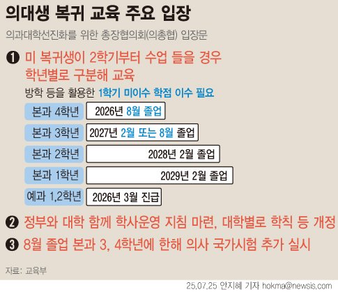복귀 방안을 보면 본과 4학년은 2026년 8월, 본과 3학년은 2027년 2월 또는 8월, 본과 2학년은 2028년 2월, 본과 1학년은 2029년 2월 졸업하고 예과 1·2학년은 2026년 3월 정상 진급을 하는 내용이 담겼다. 이를 위해 1학기 미이수 학점은 방학 등을 활용해 이수하도록 했다.