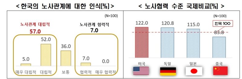 외투기업들은 한국의 노사협력 수준을 100으로 가정했을 때 다른 나라의 노사 수준을 묻는 말에는 미국 122.0, 독일 120.8, 일본 115.0, 중국 83.8 등으로 말했다. 중국을 제외한 선진 3개국 모두 노사협력 부문에서 한국보다 우위라는 해석이다.