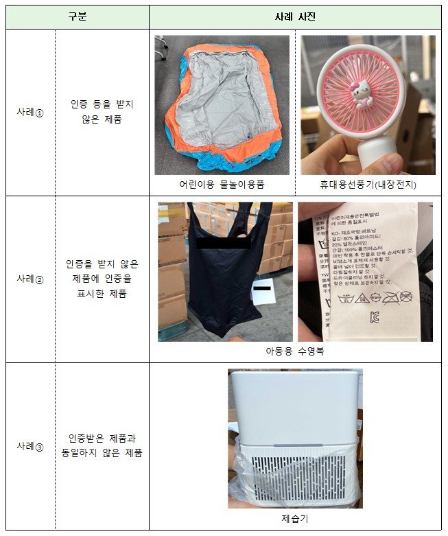 이외에 적발된 물품으로는 △안전 인증을 받지 않은 어린이용 물놀이용품, △인증 당시와 내부 설계가 상이해 안전성이 담보되지 않은 제습기 등이 확인되었다.