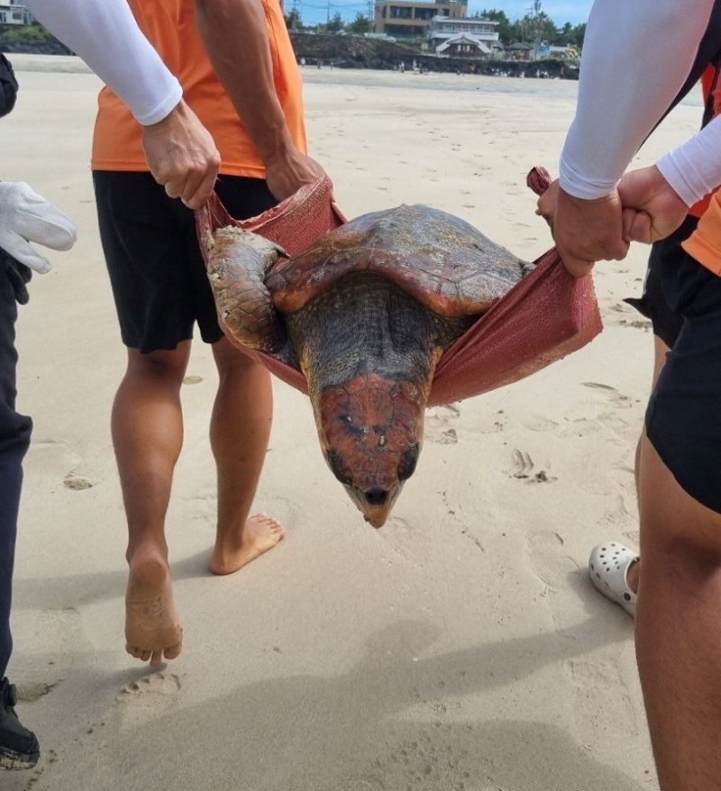 신고를 받은 해경은 해수욕장 안전요원과 함께 거북이를 해안가로 이동시킨 후 산소 공급 및 수온 유지 등 응급조치를 실시했다.