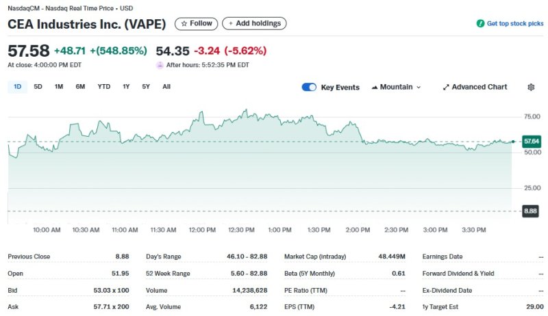이날 뉴욕증시에서 CEA는 548.85% 폭등한 57.58달러로 장을 마감했다