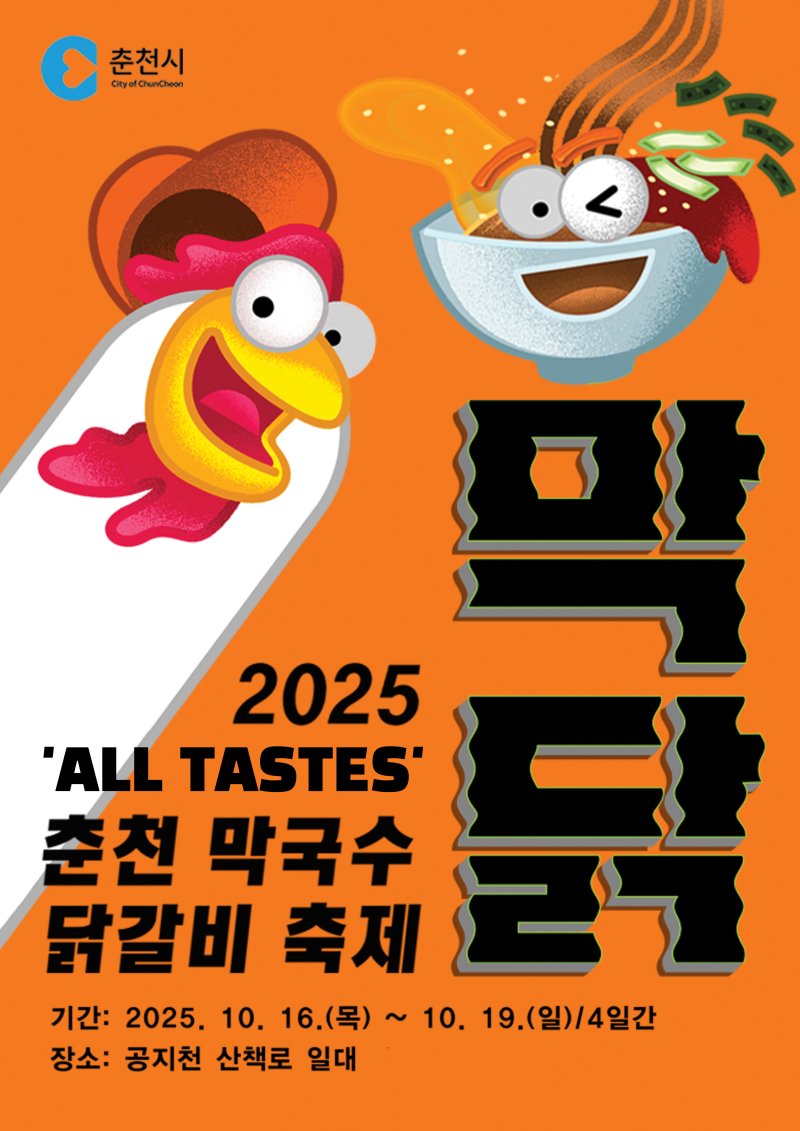 29일 시에 따르면 축제 이름은 ‘All tastes, 2025 춘천막국수·닭갈비축제’로 정하고, 메인 로고 슬로건은 "막닭을 ‘맞닥’ 뜨려뜨렸을 때, 온몸으로 전해지는 맛의 전율!"로 확정했다.