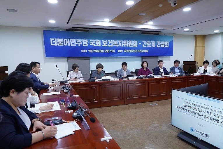 이날 박주민 보건복지위원장을 비롯해 이수진 간사, 소병훈·전진숙·김윤·서미화 의원 등 더불어민주당 소속 위원들과 간호협회 신경림 회장, 박인숙 제1부회장, 홍정희 당연직 부회장(병원간호사회 회장), 김윤숙 이사(서울성모병원 간호부장), 김정미 경기도간호사회 회장, 김경선 인천사랑병원 본부장 등이 참석했다.