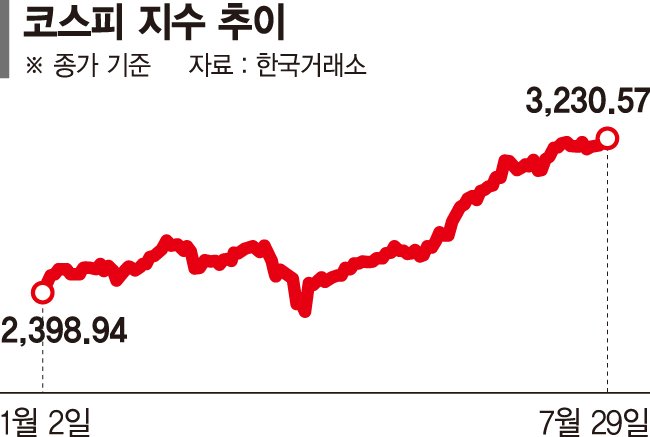 29일 한국거래소에 따르면 이날 코스피 지수는 전 거래일 대비 21.05p(0.66%) 오른 3230.57에 거래를 마쳤다. 이날 지수는 전장 대비 0.54% 하락한 3192.17로 출발했지만 장중 상승 전환한 뒤 오름폭을 키웠다.