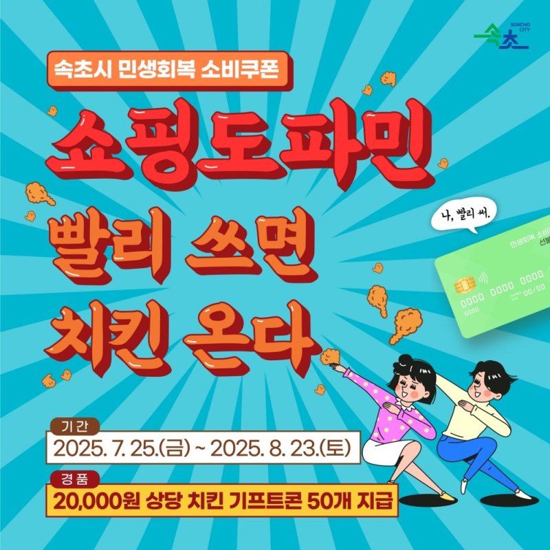속초시, 민생회복 소비쿠폰 조기 사용 유도 이벤트 실시50명 무작위 추첨해 치킨 제공…다음 달 23일까지