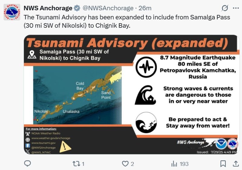 미국 국립기상청(NWS) 앵커리지 지부는 29일(현지 시간) X(구 트위터)를 통해 캘리포니아·멕시코 국경에서 알래스카 치그니크만까지 쓰나미 예보(watch)가 발효됐다고 밝혔다.