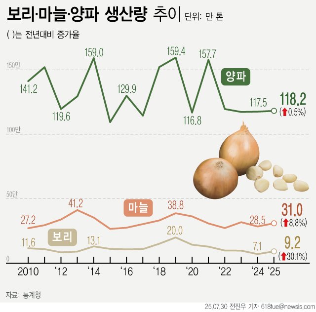 [세종=뉴시스]박광온 기자 = 올해 봄 기상 여건 양호로 보리, 마늘, 양파의 생산량이 모두 증가했다.