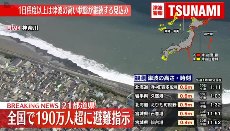 일본 기상청은 "제1파보다 이후에 오는 쓰나미가 더 클 수 있다"며 해안이나 하천 부근에 있는 주민들에게 고지대로의 신속한 대피를 촉구했다.