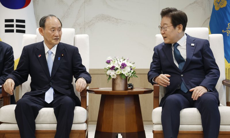 이 대통령은 "스가 총리께서 한일관계 발전을 위해서 이렇게 먼 길 와 주신 것에 대해서 감사드린다"며 "저희가 외국 손님들을 처음으로 맞는데, 바로 우리 스가 총리님을 첫번째로 이렇게 접견하게 돼서 영광스럽게 생각한다"고 강조했다.
