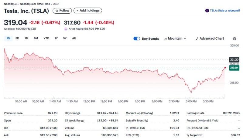 일단 테슬라는 한국의 LG에너지솔루션(이하 LG엔솔)에 43억달러(약 6조원)를 투자했다는 소식에도 주가는 0.67% 하락한 319.04달러를 기록했다.