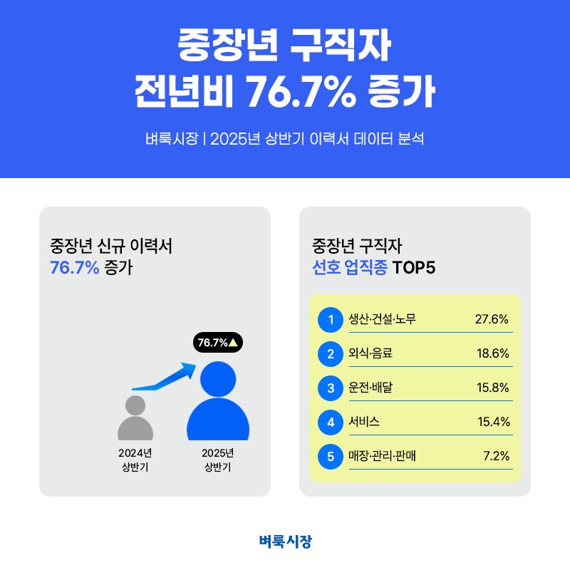 일자리 플랫폼 벼룩시장은 올해 1~6월 등록된 이력서를 분석한 결과, 50대 이상 중장년층 이력서가 전년 동기 대비 76.7% 증가했다고 31일 밝혔다. 같은 기간 40대 이하 이력서 증가율(33.9%)의 두 배를 웃도는 수치다.