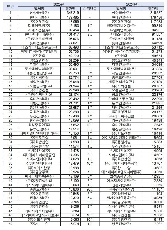 국토교통부가 31일 공개한 올해 건설업체 시공능력평가 결과를 보면 삼성물산(34조7219억원)이 12년 연속 1위를 차지했고 현대건설(17조2485억원)과 대우건설(11조8969억원)이 2, 3위를 기록했다.