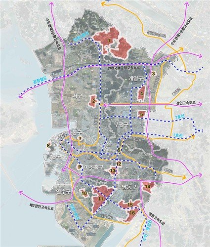 16개 구역은 중구 월미지구, 동구 송림지구. 미추홀구 용현·학익 2-1구역, 연수구 송도지구, 연수지구. 남동구 구월지구, 구월업무지구, 논현2지구, 소래·논현지구, 서창2지구, 부평구 동암역남광장지구, 삼산1지구, 계양구 계산지구, 동양지구, 서구 검단지구 택지개발사업(준공 1·2·3단계), 가정지구다.