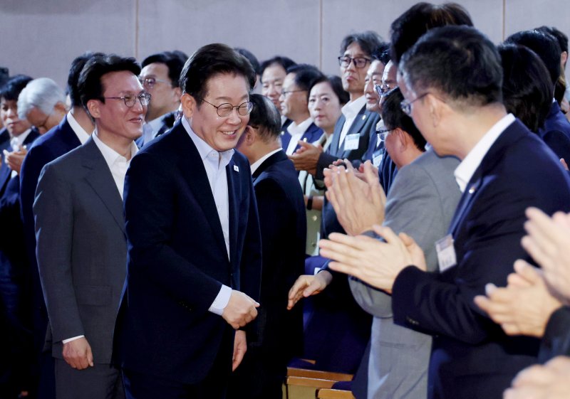 [서울=뉴시스] 최동준 기자 = 이재명 대통령이 31일 서울 종로구 정부서울청사에서 열린 '국민주권시대 공직자의 길' 고위공직자 워크숍에 입장하고 있다. (대통령실통신사진기자단) 2025.07.31. photocdj@newsis.com [서울=뉴시스]최동준 김경록 기자 = 이재명 대통령은 31일 대미 관세협상을 마무리한 뒤 장·차관급 고위 공직자들을 만나 "말을 안 해서 그렇지 가만히 있으니까 진짜 '가마니' 인줄 안다"며 "말을 하면 악영향을 주니까 말을 안 한 것"이라고 설명했다.
