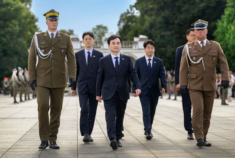 무명용사의 묘 헌화에는 폴란드군 의장대가 도열해 예우를 갖췄으며, 안 장관은 태극기 모양의 조화를 헌화했다.