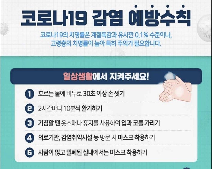 임승관 질병청장은 "코로나19 확산을 최소화하고 고위험군을 보호하려면 손 씻기, 기침 예절, 주기적인 실내 환기 등 예방 수칙을 철저히 준수하는 것이 무엇보다 중요하다"며 "기침, 발열 등 의심 증상이 있을 때는 가까운 의료기관에서 진료받고 증상이 회복될 때까지 휴식을 취해야 한다"고 권고했다.