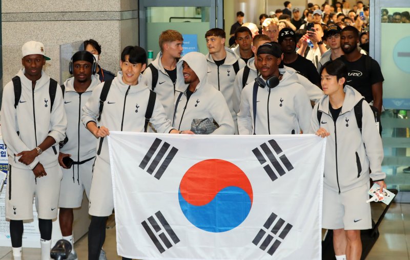 [인천공항=뉴시스] 김혜진 기자 = 토트넘 홋스퍼의 손흥민을 비롯한 선수단이 1일 오후 인천국제공항 제1터미널을 통해 입국해 태극기를 들고 기념 사진을 촬영하고 있다.토트넘은 오는 3일 오후 8시 서울 월드컵경기장에서 뉴캐슬 유나이티드와 친선전을 치른다. 2025.08.01. jini@newsis.com [서울=뉴시스]정병혁 김혜진 김진엽 기자 = 토트넘 홋스퍼의 손흥민과 양민혁을 비롯한 선수단이 1일 오후 인천국제공항 제1터미널을 통해 입국했다.