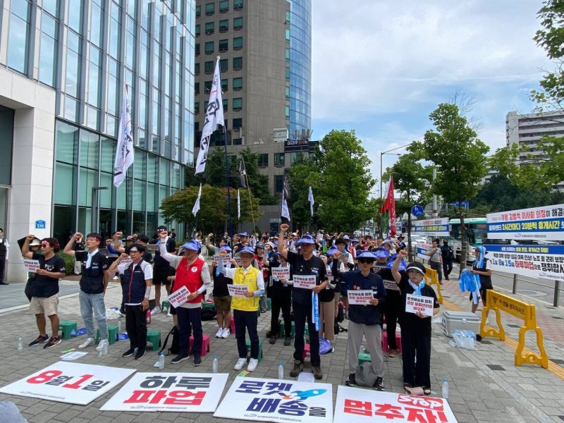 전국민주노동조합총연맹(민주노총) 공공운수노조 전국물류센터지부 쿠팡물류센터지회(쿠팡지회)는 이날 오후 송파구 쿠팡 본사 앞에서 결의대회를 열었다.