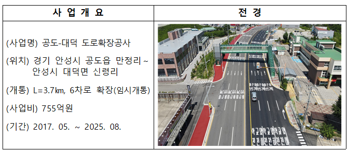 개통되는 노선은 △경북 김천(국도 59호선) △경기 안성(국도 38호선) △경기 연천(국도 3호선) △전북 진안-무주(국지도 49호선) 등이다. 이들 노선은 상습 교통정체 완화, 교통사고 위험의 구조적 개선과 대중교통 이용성 향상 등을 위해 확대 및 개량을 추진했다. 사업비는 총 2287억원이 투입됐다.