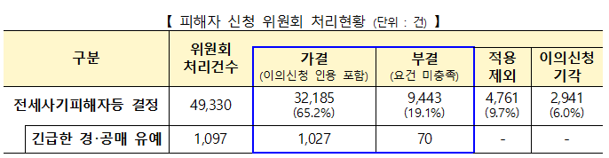 그간 위원회에서 최종 결정한 전세사기피해자등은 총 3만2185건이다. 긴급 경·공매 유예 협조요청 결정은 총 1027건으로 결정된 피해자등에게는 주거, 금융, 법적 절차 등 총 3만6141건을 지원하고 있다.