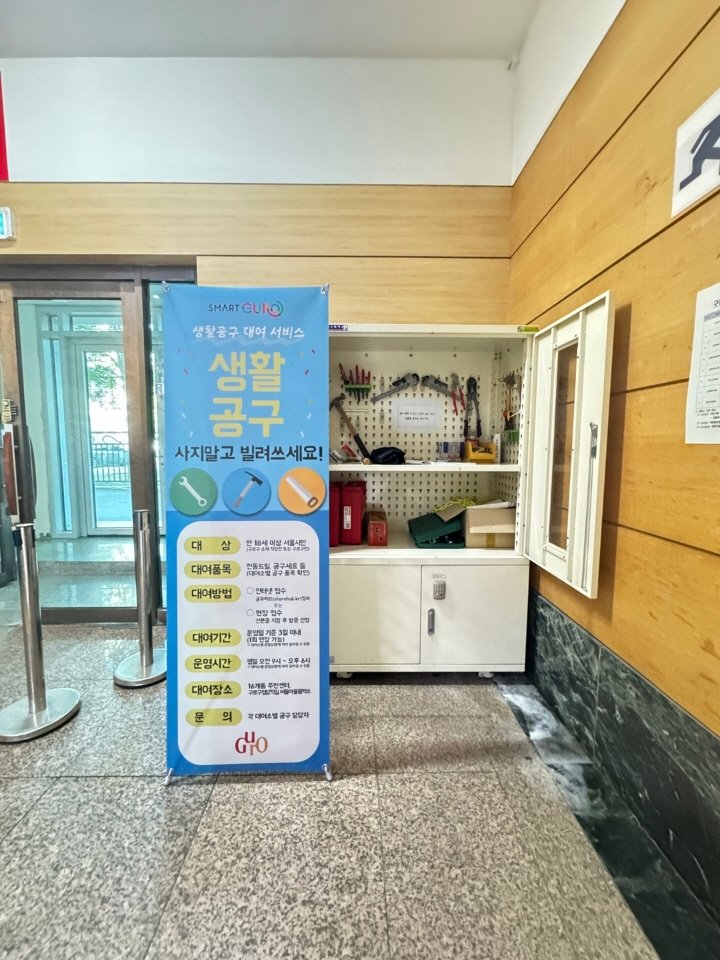 구는 주민들이 간단한 수리나 집안일에 필요한 공구를 손쉽게 대여할 수 있도록 16개 동 주민센터, 구청 당직실, 천왕역 버들마을활력소 등 가까운 곳에서 편리하게 이용할 수 있도록 운영하고 있다.