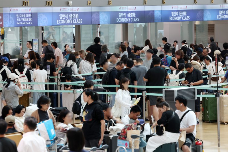 [인천공항=뉴시스] 조성우 기자 = 여름 휴가철인 3일 인천국제공항 제1여객터미널 출국장이 이용객들로 북적이고 있다. 2025.08.03. xconfind@newsis.com [서울=뉴시스]고범준 조성우 기자 = 여름 휴가철인 3일 인천국제공항 제1여객터미널 출국장이 이용객들로 북적이고 있다.